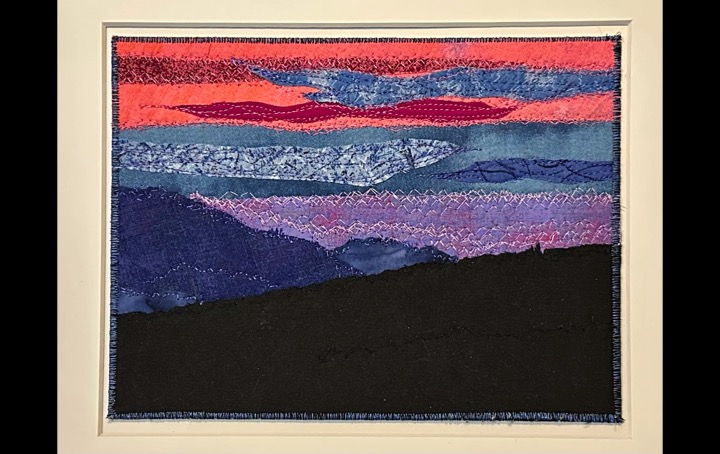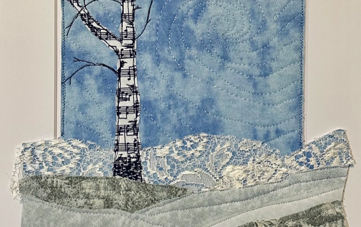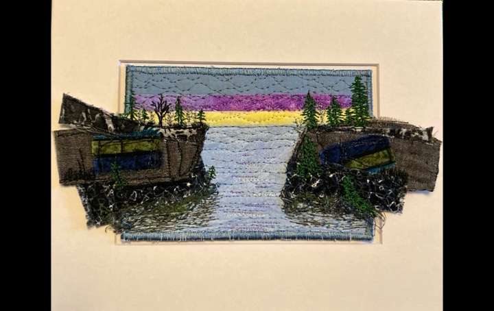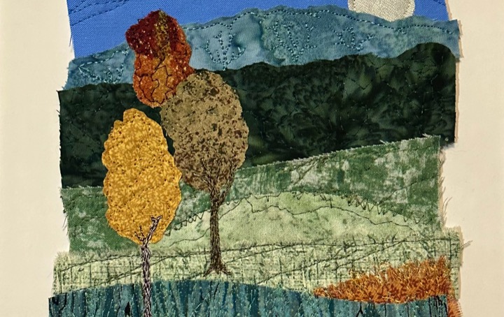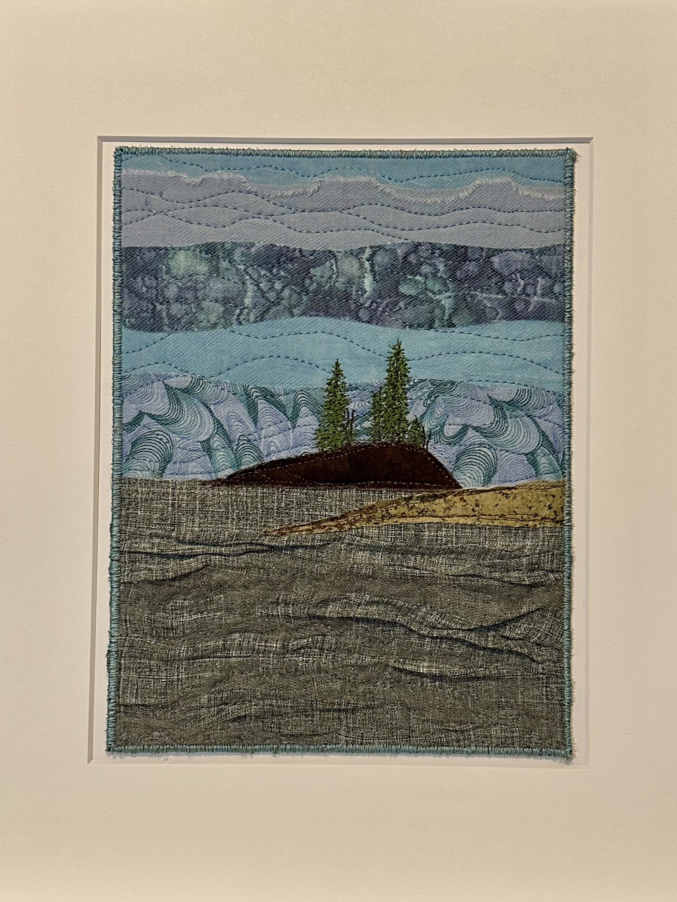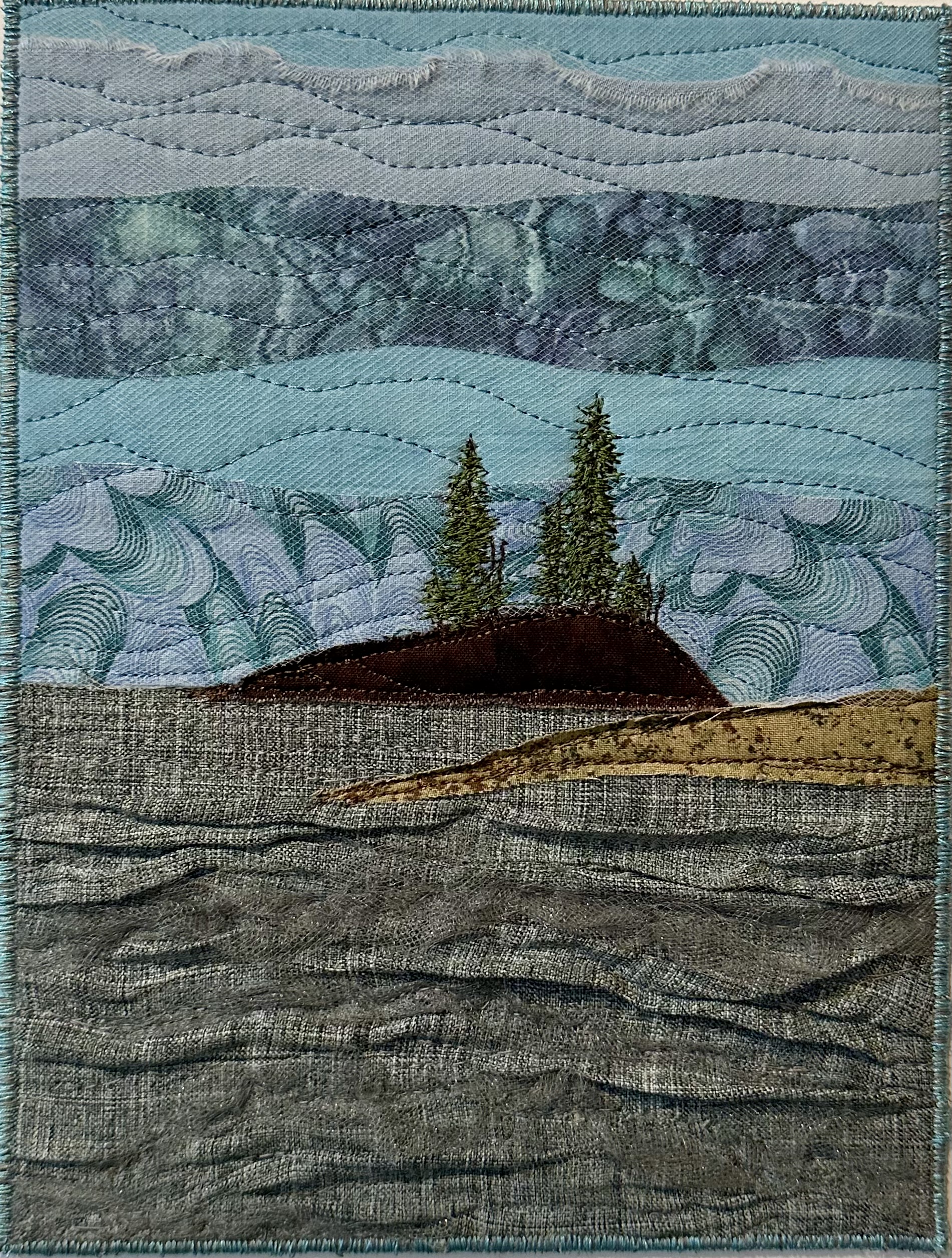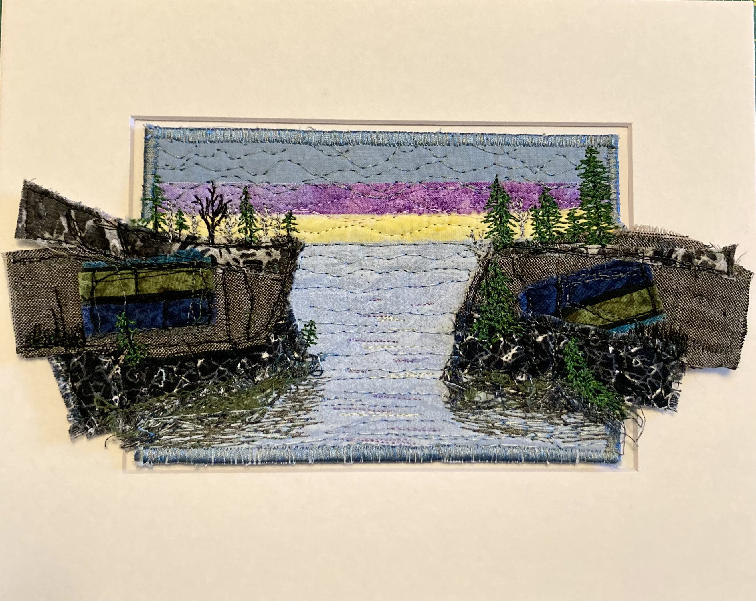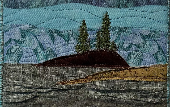 I am a part-time textile artist in Duluth, Minnesota. I’ve been sewing something or other for over 30 years. I can follow a pattern, or make my own pattern, but most often I prefer to do whatever I want and just wing it! My preference is to use as much repurposed materials as I can—through a small network of seamstresses who pass on their scraps, a huge stack of denim jeans to repurpose & recycle, and thrifting for other fabrics. My other hobby is hiking in the natural beauty of our Minnesota North Shore and surrounding areas. These two interests combine in my art as I reimagine North Shore scenery in layers of fabric and thread. I see beauty in textures everywhere and hope you see our North Shore in a new, exciting way through my work!