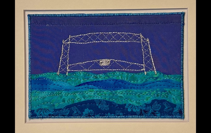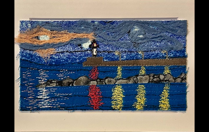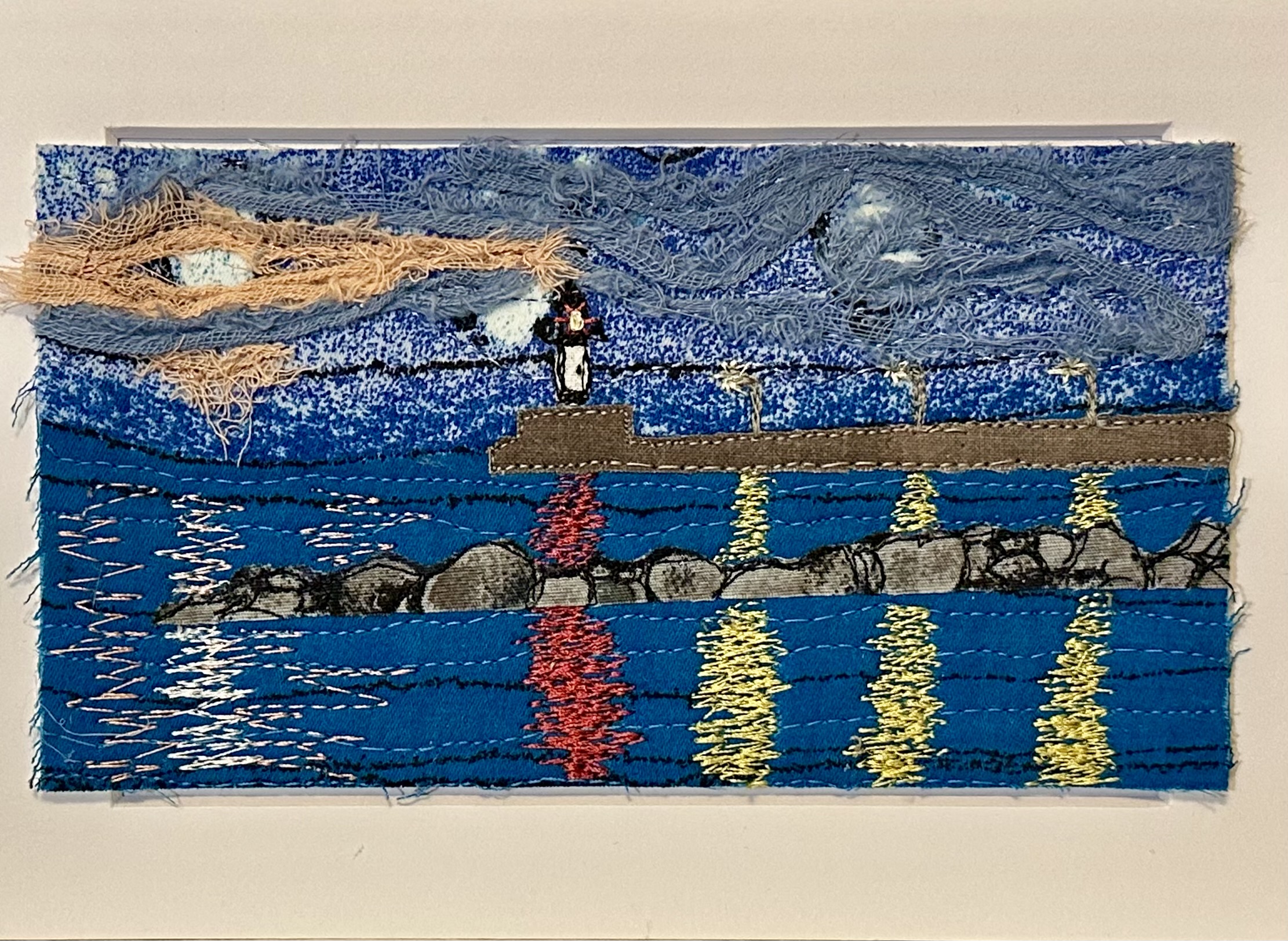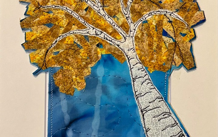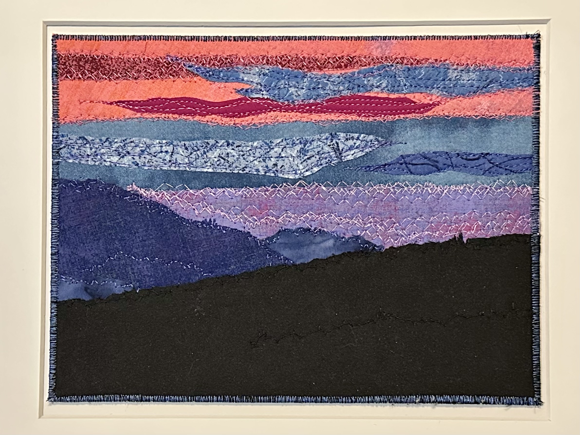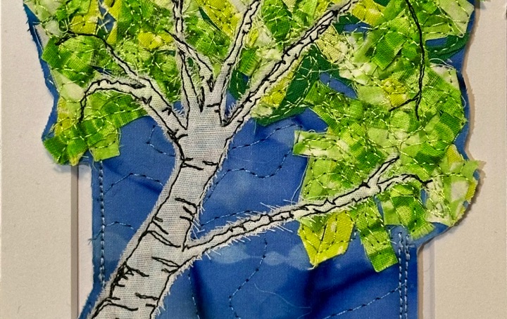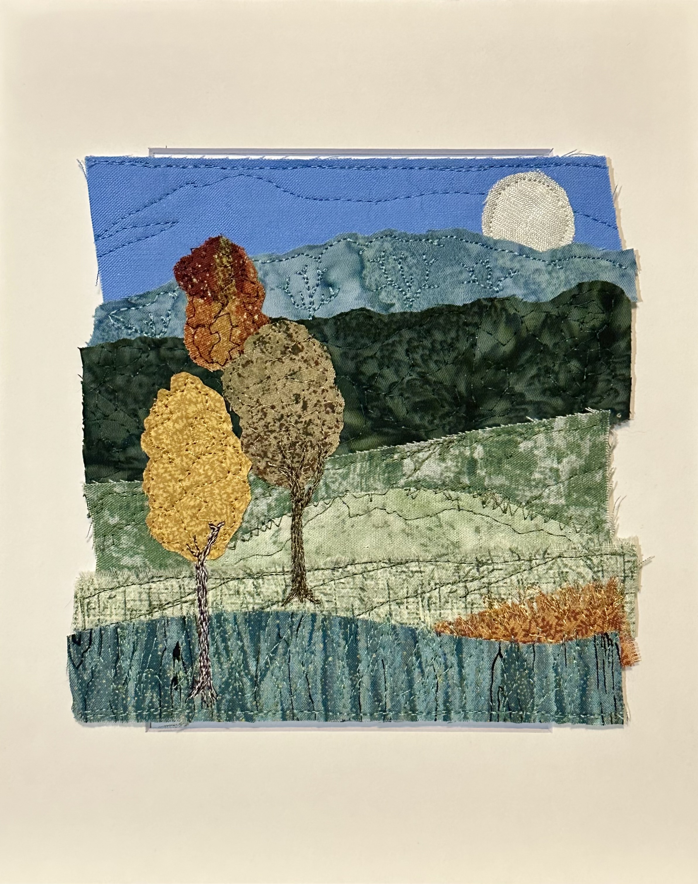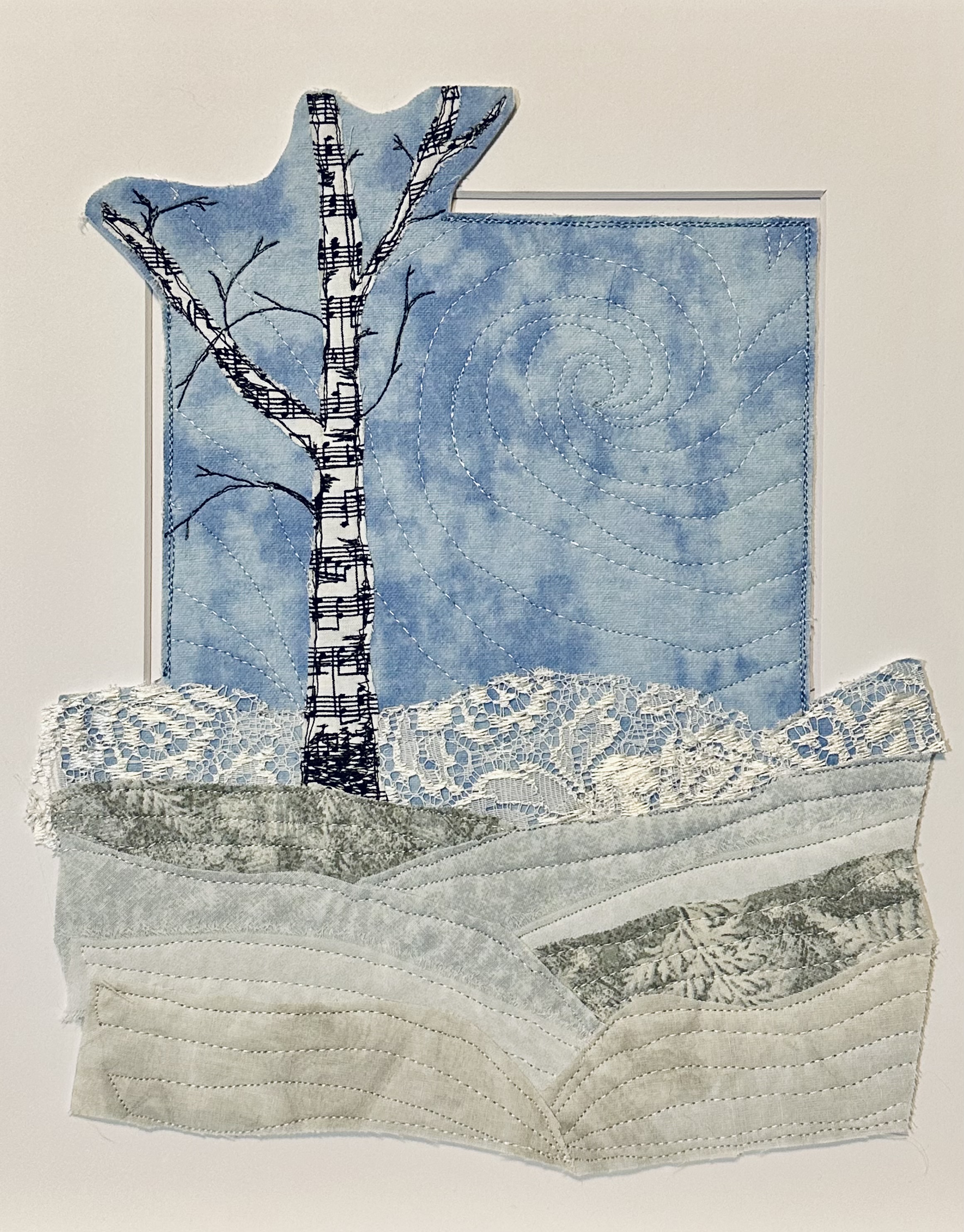 I am a part-time textile artist in Duluth, Minnesota. I’ve been sewing something or other for over 30 years. I can follow a pattern, or make my own pattern, but most often I prefer to do whatever I want and just wing it! My preference is to use as much repurposed materials as I can—through a small network of seamstresses who pass on their scraps, a huge stack of denim jeans to repurpose & recycle, and thrifting for other fabrics. My other hobby is hiking in the natural beauty of our Minnesota North Shore and surrounding areas. These two interests combine in my art as I reimagine North Shore scenery in layers of fabric and thread. I see beauty in textures everywhere and hope you see our North Shore in a new, exciting way through my work!