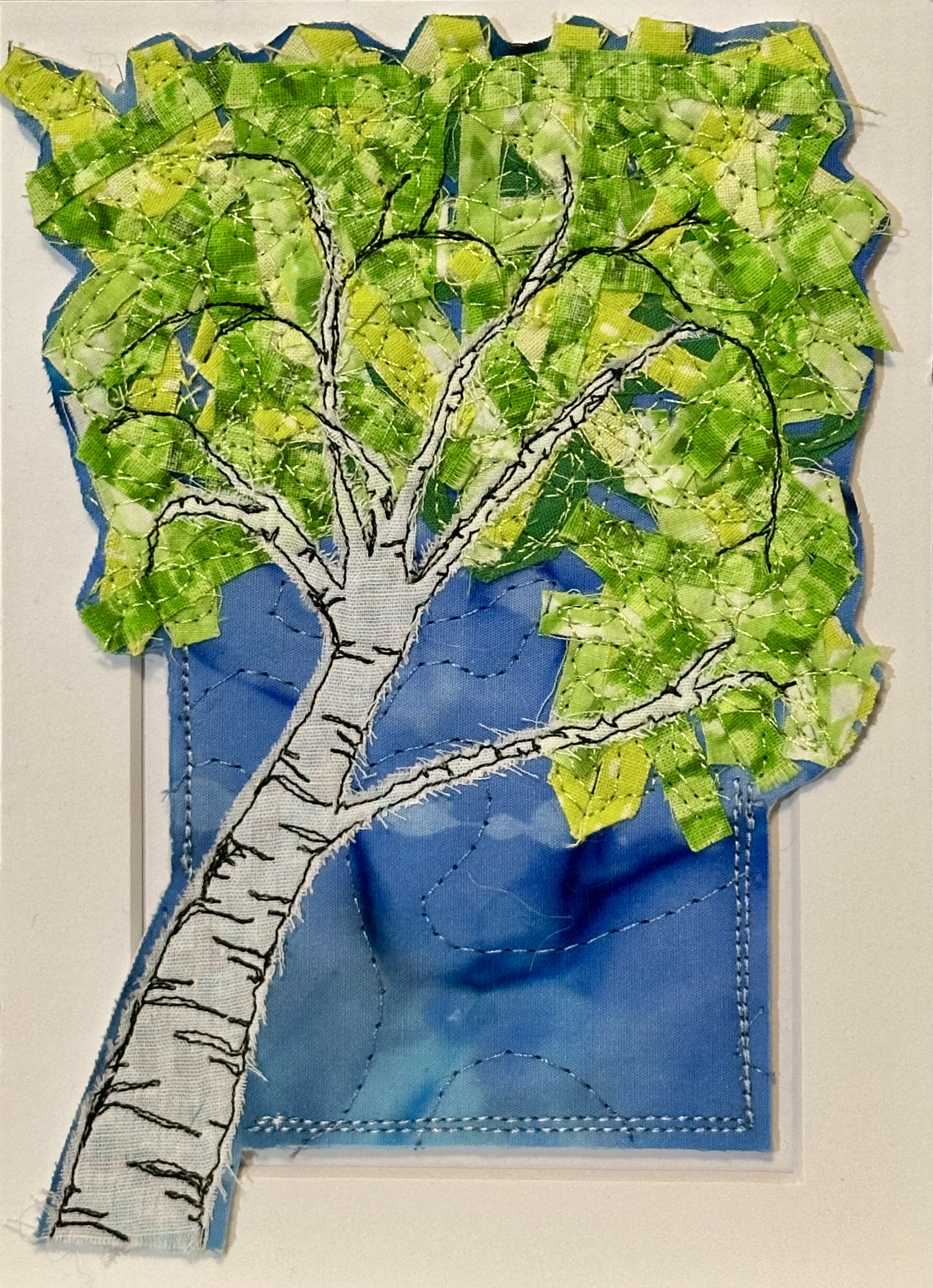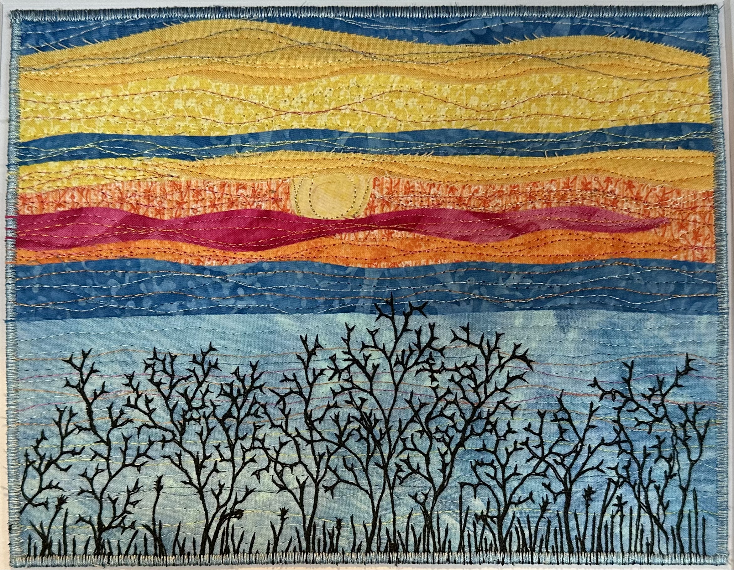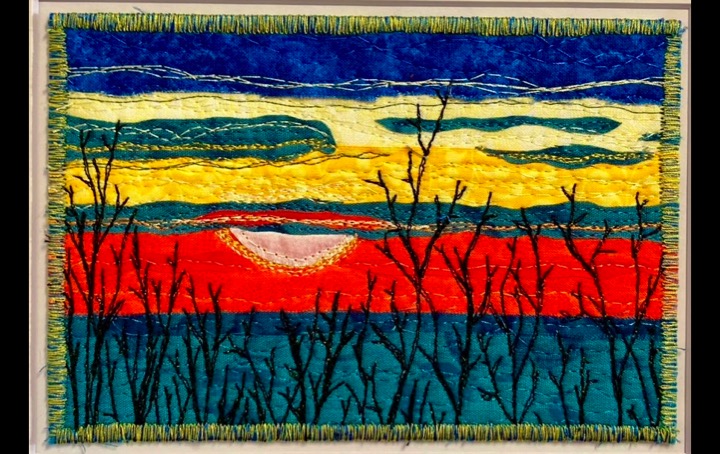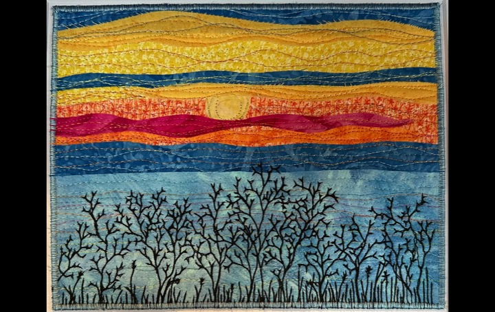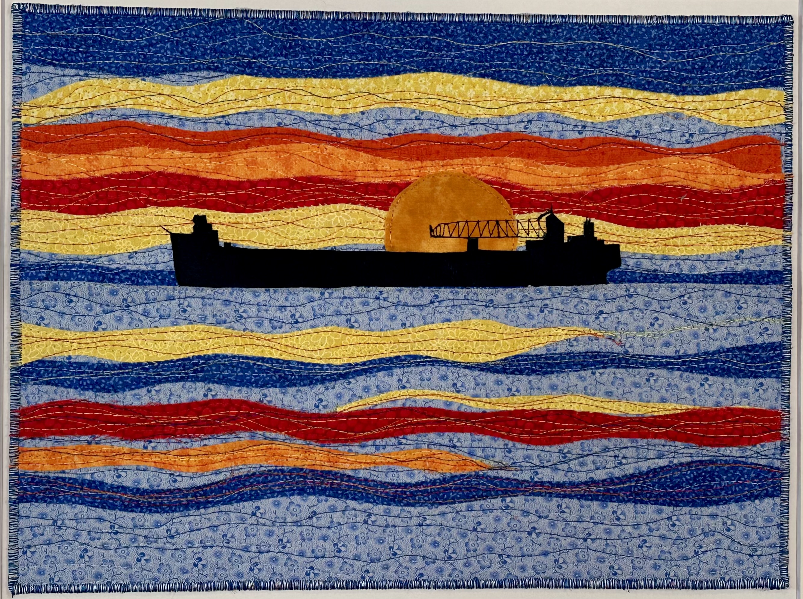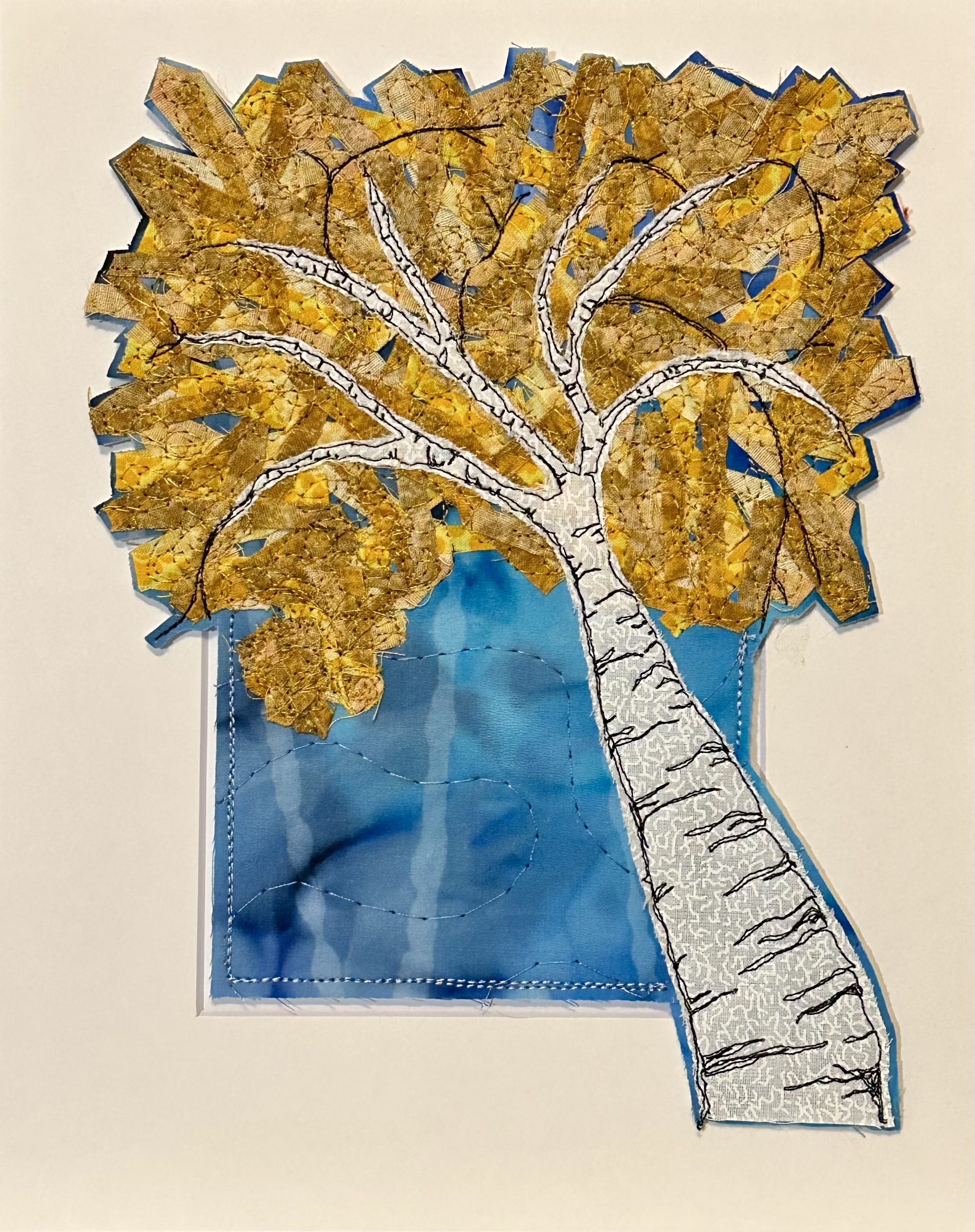 I am a part-time textile artist in Duluth, Minnesota. I’ve been sewing something or other for over 30 years. I can follow a pattern, or make my own pattern, but most often I prefer to do whatever I want and just wing it! My preference is to use as much repurposed materials as I can—through a small network of seamstresses who pass on their scraps, a huge stack of denim jeans to repurpose & recycle, and thrifting for other fabrics. My other hobby is hiking in the natural beauty of our Minnesota North Shore and surrounding areas. These two interests combine in my art as I reimagine North Shore scenery in layers of fabric and thread. I see beauty in textures everywhere and hope you see our North Shore in a new, exciting way through my work!